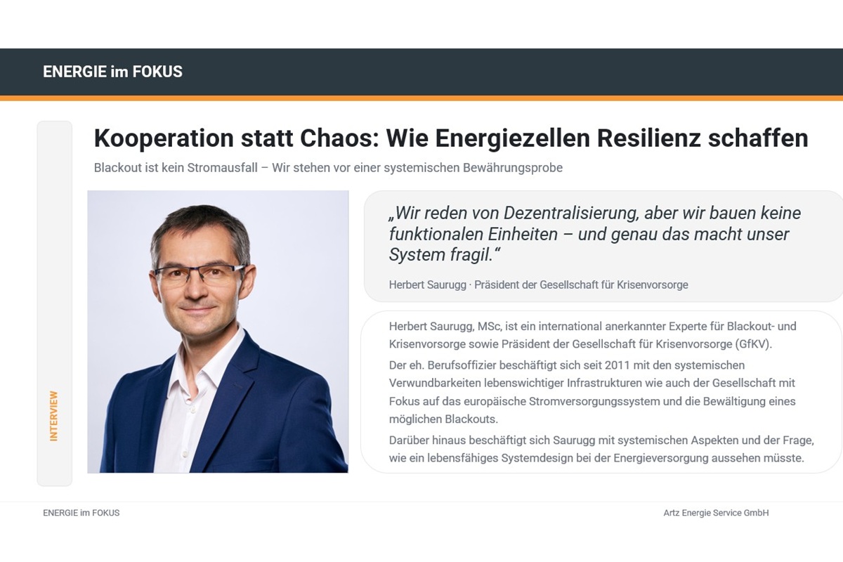 Resilienz beginne dort, wo es nicht nur um Eigenoptimierung gehe. Herbert Saurugg meint: Echte Widerstandsfähigkeit entsteht durch „Energiezellen“ – funktionale Einheiten mit notversorgungsfähiger Rückfallebene. Im Alltag optimieren sie Energieflüsse und Kosten, im Krisenfall sichern sie kritische Infrastruktur. Entscheidend sei dabei Kooperation statt Autarkie-Denken.